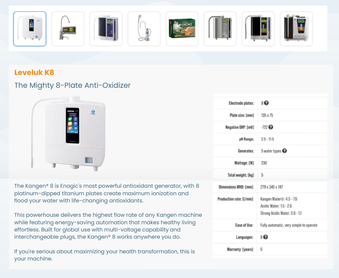 The Kangen® 8 is Enagic's most powerful antioxidant generator, with 8 platinum-dipped titanium plates create maximum ionization and flood your water with life-changing antioxidants.